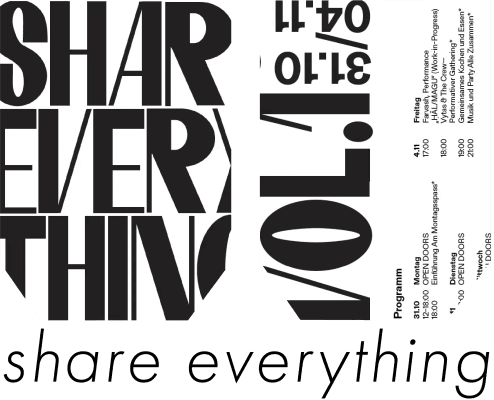 share everything ist eine performative Ausstellung in drei Serien Vol.1 / Vol.2 / Vol.3, die in Oberhausen-Mitte einen Raum für die Entwicklung kollektiver Aktivitäten, partizipatorischer Aktionen, Kunst- und Musikperformances bietet.
