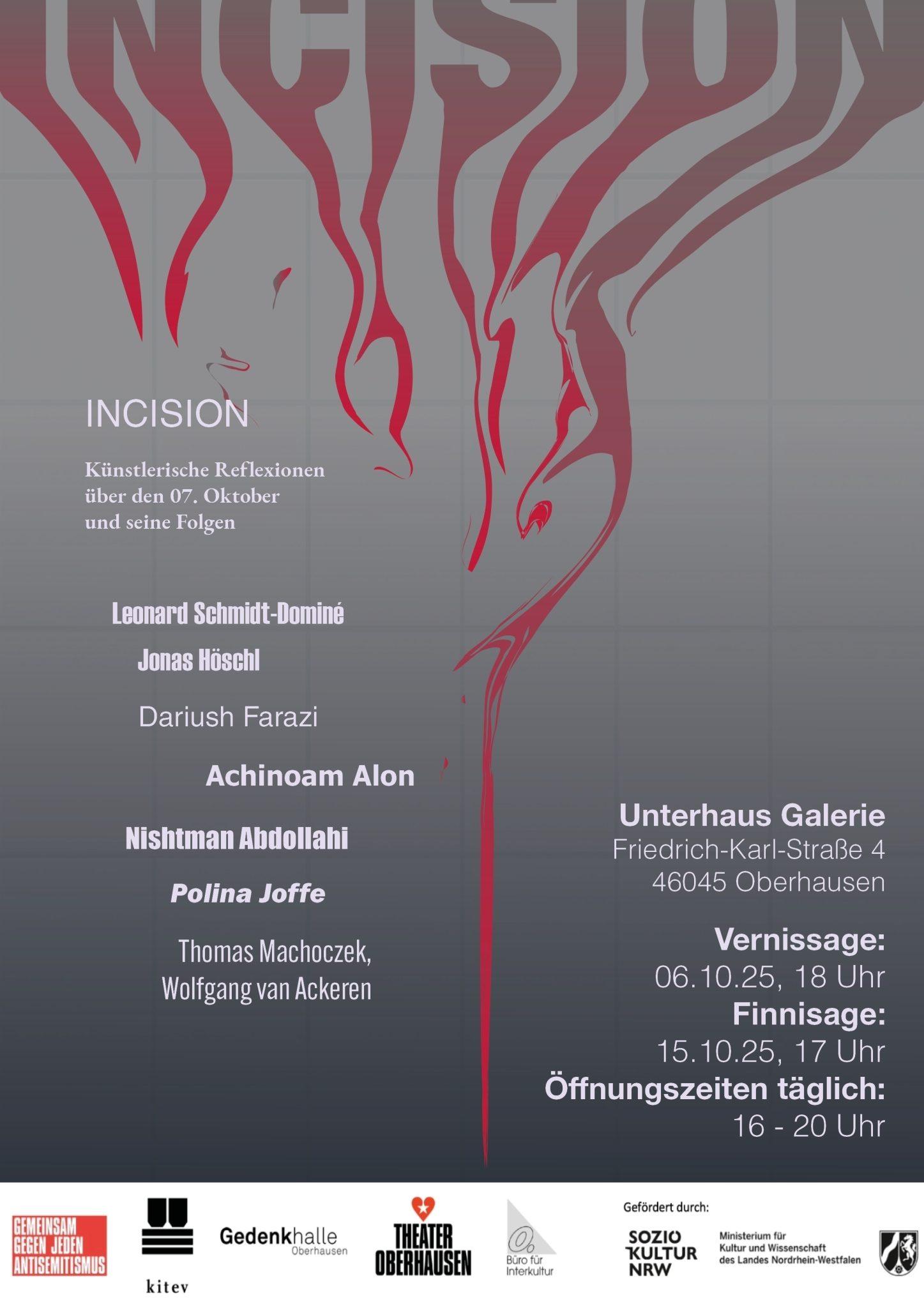 Die Ausstellung INCISION bringt künstlerische Positionen zusammen, die sich mit dem 7. Oktober 2023 und seinen weitreichenden Folgen auseinandersetzen. Eingeladene Stimmen – jüdische, israelische, migrantisierte, exilierte und queere Perspektiven – eröffnen vielfältige Sichtweisen auf die Auswirkungen dieses Tages.