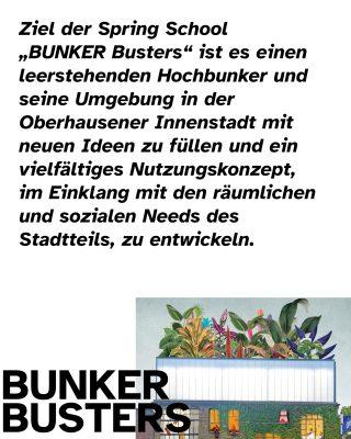Ziel der Spring School BUNKER Busters ist es den leerstehenden Hochbunker in der Helmholtzstraße 97 in Oberhausen und seine Umgebung mit neuen Ideen zu füllen und ein vielfältiges Nutzungskonzept, im Einklang mit den räumlichen und sozialen Needs des Stadtteils, zu erarbeiten.