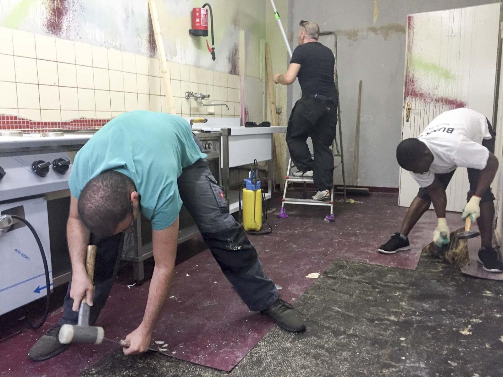 At the end, of course, was the time for the decorative finish. The wall tile line above the worktop in the kitchen has now been extended by a harmonious pattern mix. As soon as the last tile was set, the long-awaited new kitchen appliances finally arrived in the „Unterhaus“. By looking at the six-burner gas stove, many professional chefs would likely get tears of envy in their eyes. Our colleague Ahmad can hardly wait for the new equipment to be in use. This will already be the case in the coming days, when it´s time for d.ramadan! Because there the Refugees' Kitchen supports the great program by the Theater Oberhausen on 23 days with an evening of breaking the act of fasting.