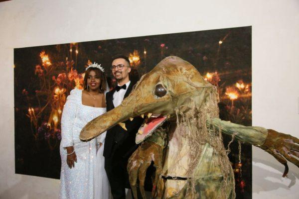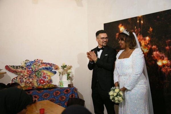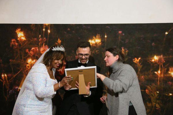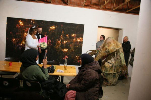 Wir haben schon zu Beginn etwas Romantisches angedeutet. Für alle, die es nicht live erlebt haben, wollen wir diese schöne Geschichte nicht vorenthalten. Monster Money Maus war bereits auf Einladung des Transnationalen Ensembles Labsa in Dortmund im Jahr 2021 zu Gast. Es waren die ersten Jahre von kitevs großem Projekt GENAU. Redouanne & Samar waren beide Teilnehmer des Projekts GENAU in kitev und wurden zu einem Theaterworkshop mit Money Maus nach Dortmund eingeladen. So haben sich Redouanne & Samar kennengelernt! Und wie es das Leben so will, haben sie 2023 am 15. Dezember geheiratet. Nochmals herzlichen Glückwunsch an das Paar. Die Feier fand in unserer Unterhaus-Galerie statt und die Geschenkübergabe war ziemlich überraschend und performativ!