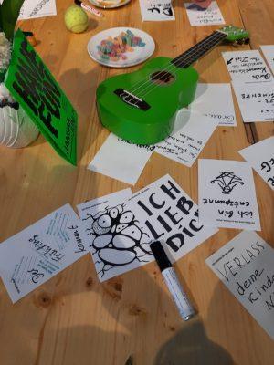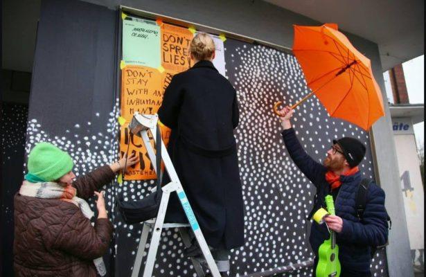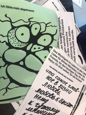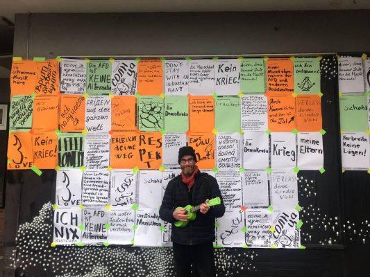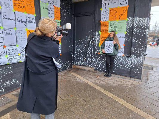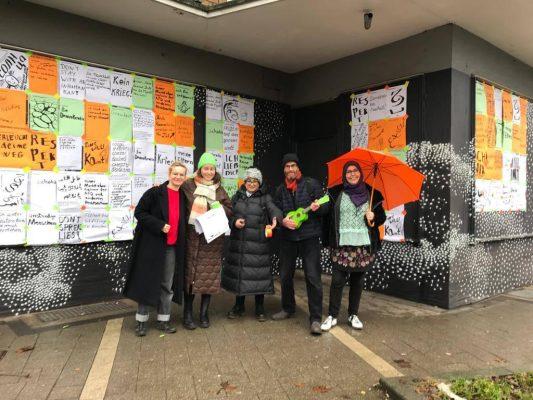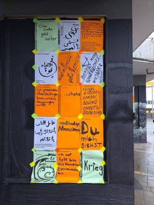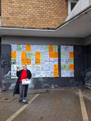 Auf kleinen Zetteln haben die Menschen geschrieben, was ihnen auf dem Herzen liegt. Es ist schwer ein Wort zu finden, das die Mischung aller Gedanken und Gefühlen beschreiben könnte. Von herzzerreißend bis lustig, tiefgründig, traurig, hochpolitisch, süß und schmerzhaft ist alles dabei. Indre in Rekordtempo - aus allen Statements und teilweise sogar mit der Übersetzung 69 Plakate gestaltete. Am Sonntag haben wir bei Wind und Wetter unsere eine Art Wandzeitung für die Oberhausener Öffentlichkeit sichtbar gemacht! Es herrschte ein wunderbares solidarisches Gemeinschaftsgefühl!