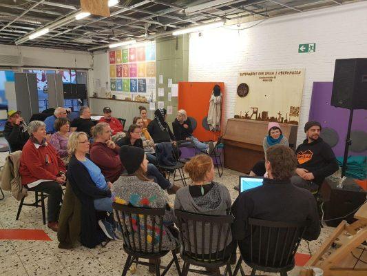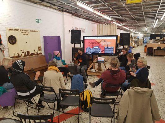 Im Rahmen unserer Veranstaltungsreihe Zukunft Supermarkt der Ideen hatten wir am 11.03.2024 die b-side aus Münster zu Gast, um über die Möglichkeiten kollektiven Gestaltens am Münsteraner Hafen zu sprechen. Aus der Idee günstige Arbeitsräume zu erhalten, entwickelt sich die b-side nun zu einem soziokulturellen Quartierszentrum mit einer Fläche von 3000m², welches Proberäume, Gruppenräume, eine Allmende-Küche, einen Bewegungsraum, eine Werkstatt und vieles mehr bereithält. Das Konzept der Urban Commons und der Soziokratie sind Leitlinien für das Miteinander in der b-side, wobei die Pflege und nicht nur die Nutzung von Gemeinschaftsgütern im Vordergrund steht.
