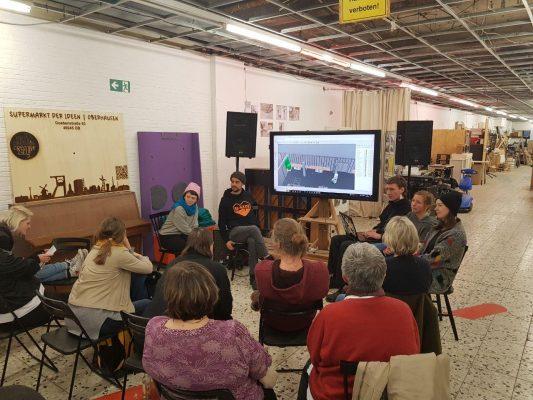Da die b-side aktuell dabei ist ihren sanierten Hafenspeicher mit einer neu konzipierten offenen Werkstatt auszustatten, war der Austausch mit Nutzer*innen des Supermarkts der Ideen besonders hilfreich, da ein Umbau sowie Aus- und Wiedereinzug dem Supermarkt-Team auch bevorsteht. Die mit 160m² große Werkstatt der b-side kann sehr flexibel genutzt werden, weshalb die Holz-, Metall-, oder Fahrradwerkstatt mit wenig Umbauarbeit und leicht verschiebbaren Arbeitsmodulen bestückt wird. Bei der Anschaffung der Maschinen wurde bewusst versucht auf gebrauchte Geräte zurückzugreifen, um ressourcenschonender zu arbeiten. Eine kommerzielle Nutzung der Werkstatt durch professionelle Handwerker*innen, die sich temporär einmieten können, ist nicht vorgesehen.