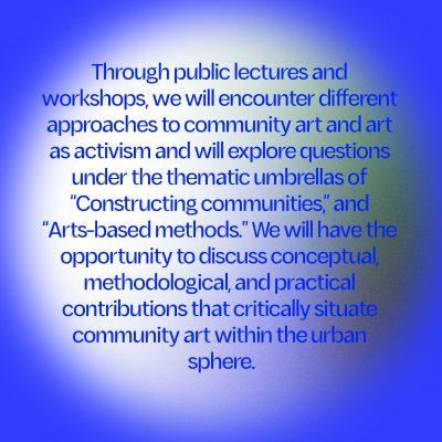 Through public lectures and workshops, we will encounter different approaches to community art and art as activism and will explore questions under the thematic umbrellas of “Constructing communities,” and “Arts-based methods.”
