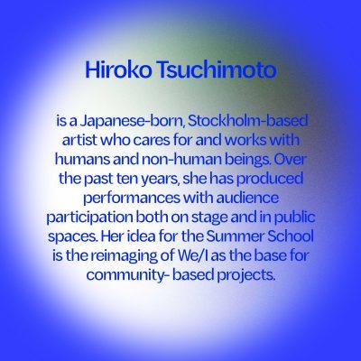 Hiroko Tsuchimoto is a Japanese-born, Stockholm-based artist who cares for and works with humans and non-human beings. Over the past ten years, she has produced performances with audience participation both on stage and in public spaces. Her idea for the Summer School is the reimaging of We/I as the base for community- based projects. I/We create a shared space and time to reimagine who and how WE are: how to apply our subjectivity to the more-than-human world, how to do with nonhuman-entities, such as plants, animals, objects, forces of nature and technology, and how to expand the definition of collaborations and communities to non-human ecologies -beyond the biological divisions and hierarchies. We (un)learn our human-centered perspectives and positionality, how to see in/relate to/respect nonhuman spaces in the city, and how to share our feelings and thoughts with intimate and embodied tempos. Through somatic practices, such as collective listening, drawing, and attentive walking indoors and outdoors, we reflect upon the correlation between creativity and ethics in human/nonhuman community-based works.
