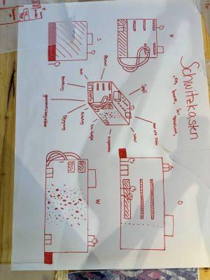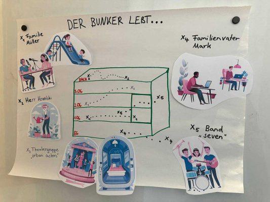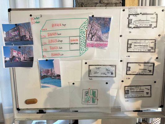 Am Ende der Spring School wurden drei sehr unterschiedliche Nutzungskonzepte präsentiert. Das erste Konzept, der „Bunte Bunker“, legte den Fokus auf die vielfältige Innennutzung des Bunkers. Hier wurde ein bunter Mix aus verschiedenen Nutzungen kombiniert, um den Raum lebendig und vielseitig zu gestalten. Eine andere Gruppe richtete ihre Aufmerksamkeit stärker auf den umliegenden Raum und die Verbindung des Bunkers mit den benachbarten Gebäuden. Ihr Ziel war es, den „Nicht-Ort“ Bunker in eine einladende Oase zu verwandeln. Die dritte Gruppe entwickelte ein monothematisches Nutzungskonzept: Als „Schwitzkasten“ soll der Bunker künftig ein Ort für Sport und Bewegung sein, der sozial gerechte Teilhabe in den Mittelpunkt stellt.