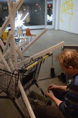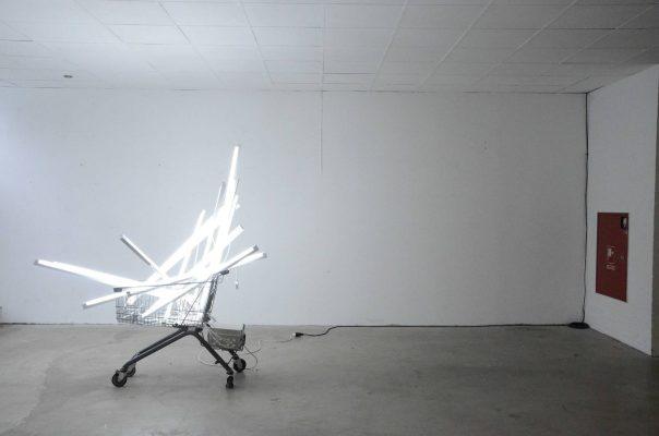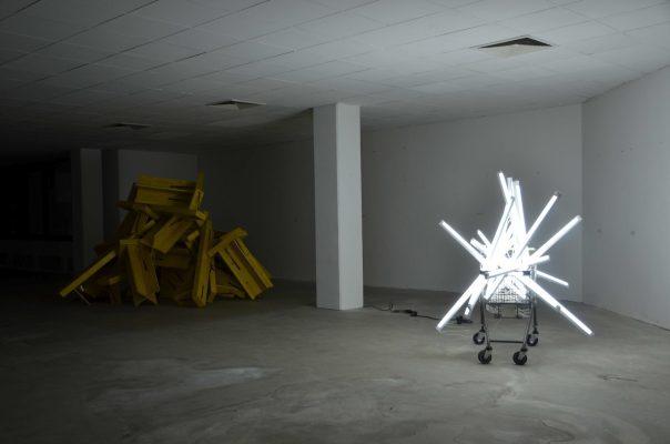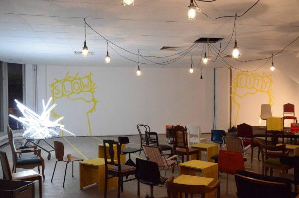 Wir haben ein handgemachtes Provisorium geschaffen mit minimalen Mitteln: Wiederverwendete Requisiten der Ruhrtriennale, Klebeband, Einkaufswägen und Leuchtstofflampen. Das Motto 'Slow City' prangt an den Wänden, weil wir im fehlenden Investitionsdruck in den Innenstädten nicht nur leere Ladenlokale entstehen sehen, sondern Freiräume. So gesehen ist Leerstand ist nicht nur Makel, sondern eine Chance etwas Neues auszuprobieren.