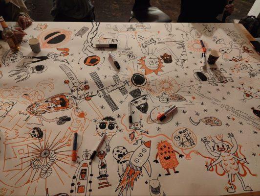 Zur Gründungskommission für dieses Semester durften wir nicht öffentlich einladen, dies wäre eine verbotene Veranstaltung gewesen. Also verabredeten sich nur die bereits zuvor Involvierten, dies war ein erlaubtes Arbeitstreffen. Sie alle hatten die Schwierigkeiten des letzten Jahres erfahren und keine Lust auf Wiederholung. Natürlich nicht auf einen nochmaligen Lockdown, doch ebensowenig auf täglich wechselnde Vorschriften und Einschränkungen für Begegnungen in Innenräumen. Die Gründungskommission fand eine gordische Lösung: Veranstaltungen ausschließlich draußen! Aus dieser Not wurde schnell auch eine Lust: Wir besorgten – farblich an unser Lastenfahrrad, das nun unser zweitwichtigster Mitarbeiter wurde, angepasstes – Equipment: Klappstühle, Sonnenschirme, Klapptische, Tischdecken, Wärmedecken. Und eine taubenblaue Camping-Kühlbox. Der Anlass war mies, die Challenge wurde lustvoll angegangen, das Ergebnis war beindruckend und monatelang quartiersweit sichtbar: Wow, was alles im offenen Stadtraum geht – umsonst und draußen und alles in orange!