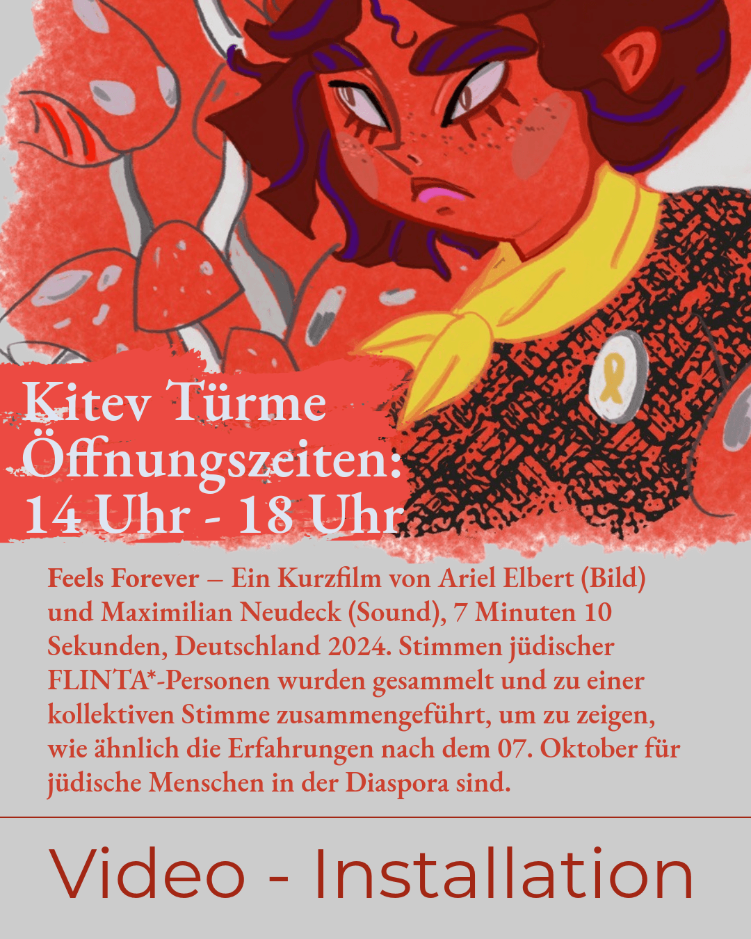 Der Kurzfilm Feels Forever von Ariel Elbert (Bild) und Maximilian Neudeck (Sound) (7:10 Min, Deutschland 2024), präsentiert in den Wassertanks des Bahnhofsturms, vereint Stimmen jüdischer FLINTA* zu einer kollektiven Perspektive und zeigt, wie ähnlich die Erfahrungen nach dem 7. Oktober in der Diaspora sind.