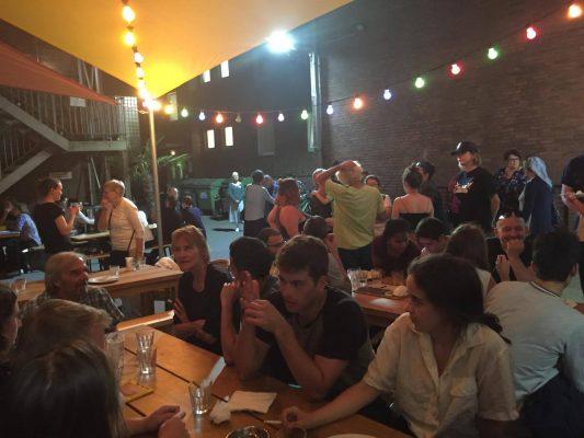 In loose keeping with the Ramadan practice of waiting until after sundown to breakfast, Kitev and the students toiled away tirelessly with the goal of serving Sunday dinner at Oberhausen Theater’s outdoor picnic area. Stefl and a group of marketing majors and studio arts students tore down interior structures for the warehouse’s renovation and took culinary direction from the kitchen team. Meanwhile, the design group sweated amongst a floor full of blueprints of the venue space for which they were to create promotion and spatial design, including signage and wayfinding for the upcoming event. By dinnertime, the design group was ready to contemplate its potential solutions over a meal under the Oberhausen Theater’s twinkling lights. Helping the Refugee Kitchen transport and serve a meal that night would be a critical step in the group’s project development, as it would help them understand how the chefs run the kitchen’s catering services.