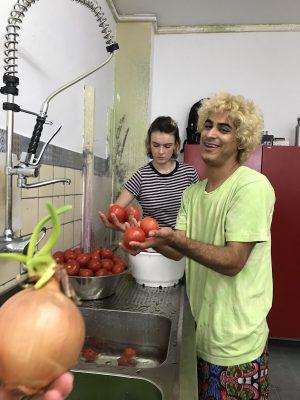 Over the delicious Ramadan spread, which included chicken and rice, a vegetarian tahini dish, dates and more, students made friends with Oberhausen Theater guests and reflected on the first day of their Kitev collaboration. “My mom always talks about her own escape from political unrest in Nicaragua. But working in the kitchen with the chefs who are seeking refuge today was the first time I really felt personally connected to the turmoil of migration,” said LMU studio arts student, Michael Mahammadie-Sabet.