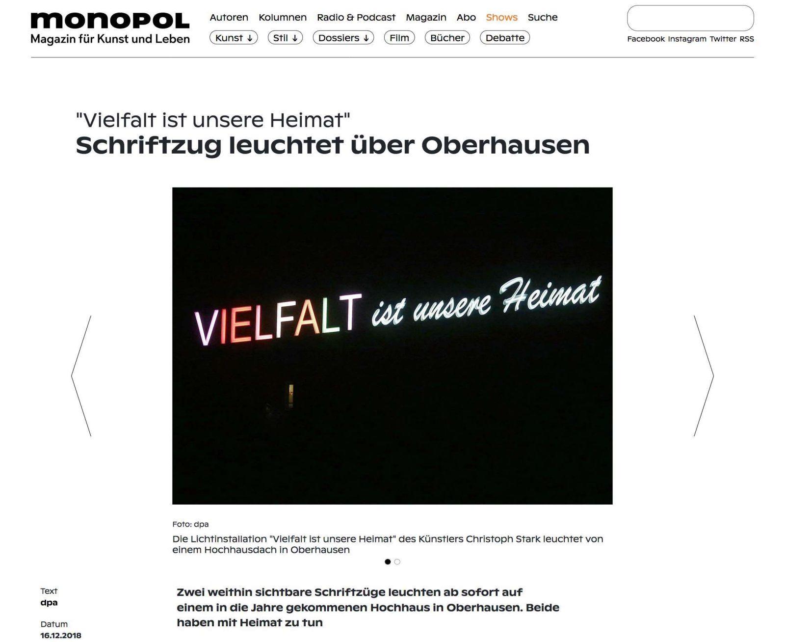 The press reported a short time later and triggered a heated debate on whether the statement was justified on this building or not. Of course, a critical discussion is always desirable as long as the statements remain on a factual level. A discussion of the terms home and diversity can only benefit the discourse. What does diversity mean in our everyday lives? Does the term only describe many different cultures or does it stand for more than that? For example, different worldviews, religions, genders, people with and without disabilities, jazz or pop music. And what does all this have to do with our homeland? The statement shines bright. It is an offer to the people of Oberhausen to discuss those questions for themselves and for the society as a whole. We already had our experiences in addressing prejudices and the changes in public discourse. At that time we were able to create a new perspective on refugees who had arrived as new citizens in the city by repairing the neon sign with the sonorous slogan "Oberhausen Wiege der Ruhrindustrie" on the building opposite the main station of Oberhausen.
