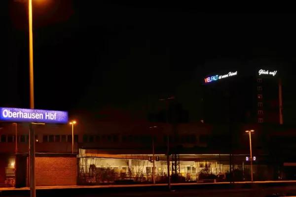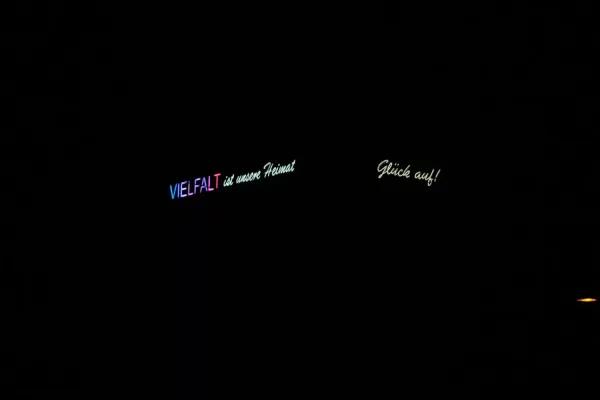 "Diversity is our home" radiates in big letters down from the roof into the city. On the other side of the building, the word "Glück Auf" welcomes train passengers from Cologne, Düsseldorf and Duisburg. The house owner Vonovia took over the costs for the production of the neon writing and thus supported the project.