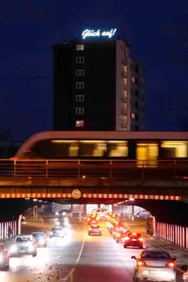 „Vielfalt ist unsere Heimat“ strahlt in großen Buchstaben vom Dach in die City hinunter. An der Seite des Hochhauses begrüßt der Schriftzug „Glück Auf“ die Bahnreisenden aus Köln, Düsseldorf und Duisburg kommend. Die Hauseigentümerin Vonovia übernahm die Kosten für die Produktion der Leuchtschrift und unterstützte somit das Vorhaben.