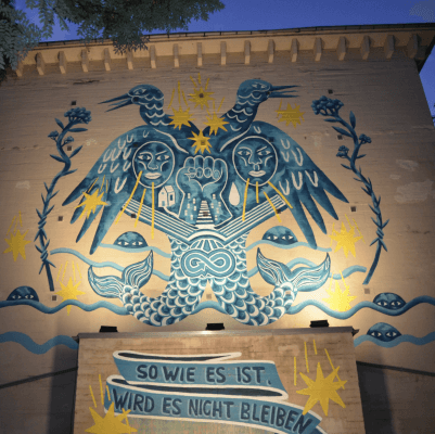 Eine weitere künstlerische Arbeit entstand ebenfalls im Duett. Aaron St (Ruhrgebiet) und Katja Bot (Paris) erschufen zunächst in gemeinsamer künstlerisch-konzeptioneller Arbeit und im September 2020 in einer zweiwöchigen Mal-Aktion ein großflächiges Wandbild auf der Fassade des Bunkers am Ebertplatz.