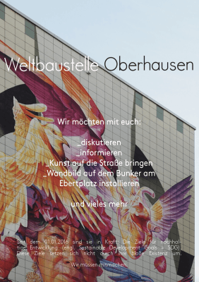 Seit dem 1. Januar 2016 sind sie in Kraft: Die 17 Ziele für nachhaltige Entwicklung (Sustainable Development Goals – SDGs) der Vereinten Nationen. Sie sind das Ergebnis einer globalen und gründlichen Debatte über die Nachhaltigkeit bisheriger Entwicklungsstrategien. Mit der Kampagne Weltbaustellen NRW hat das Eine Welt Netz NRW die Ziele für nachhaltige Entwicklung und die 2030-Agenda der Vereinten Nationen bereits mit vielen Menschen in NRW diskutiert. In den Jahren 2016 und 2017 wurden dazu in 17 Städten öffentlichkeitswirksam eine gesellschaftliche Debatte um die Ziele nachhaltiger Entwicklung angestoßen. Neben anderen Beiträgen entstand in jedem dieser 17 Städte ein großformatiges Wandbild zu den Thematiken der SDGs.