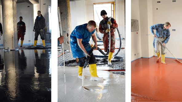 Damit aber nicht genug, kurz vor Ende des letzten Jahres lieferte uns die Firma Dyckerhoff den Anhydritestrich und das Unternehmen Harold Scholz steuerte über eine halbe Tonne farbige Pigmente bei.