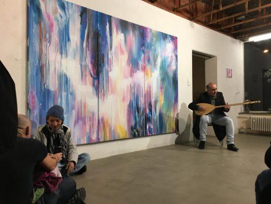Die dritte Ausstellung „Alles was Gold ist glänzt nicht“ (14.-18.12.) war von Akbar Khurasani. Ursprünglich aus Afghanistan, ging er zum Kunst-Studium in die Ukraine und floh schließlich von dort nach Deutschland. „Diese Welt hat viele Welten, und jeder kann sich in ihr wiederfinden.“, zitierte er zu seiner Vernissage am 14. Dezember aus seinem Manifest, welches eine langersehnte neue Phase seines Schaffens markiert und in der Ausstellung präsentiert wurde. „Meine Reise zu diesem Bild dauerte fast 10 Jahre. Das, wonach ich mein ganzes Leben lang gesucht habe, taucht plötzlich auf.", freute sich der Künstler, während sein Kollege Abel orientalische Klänge darbot.