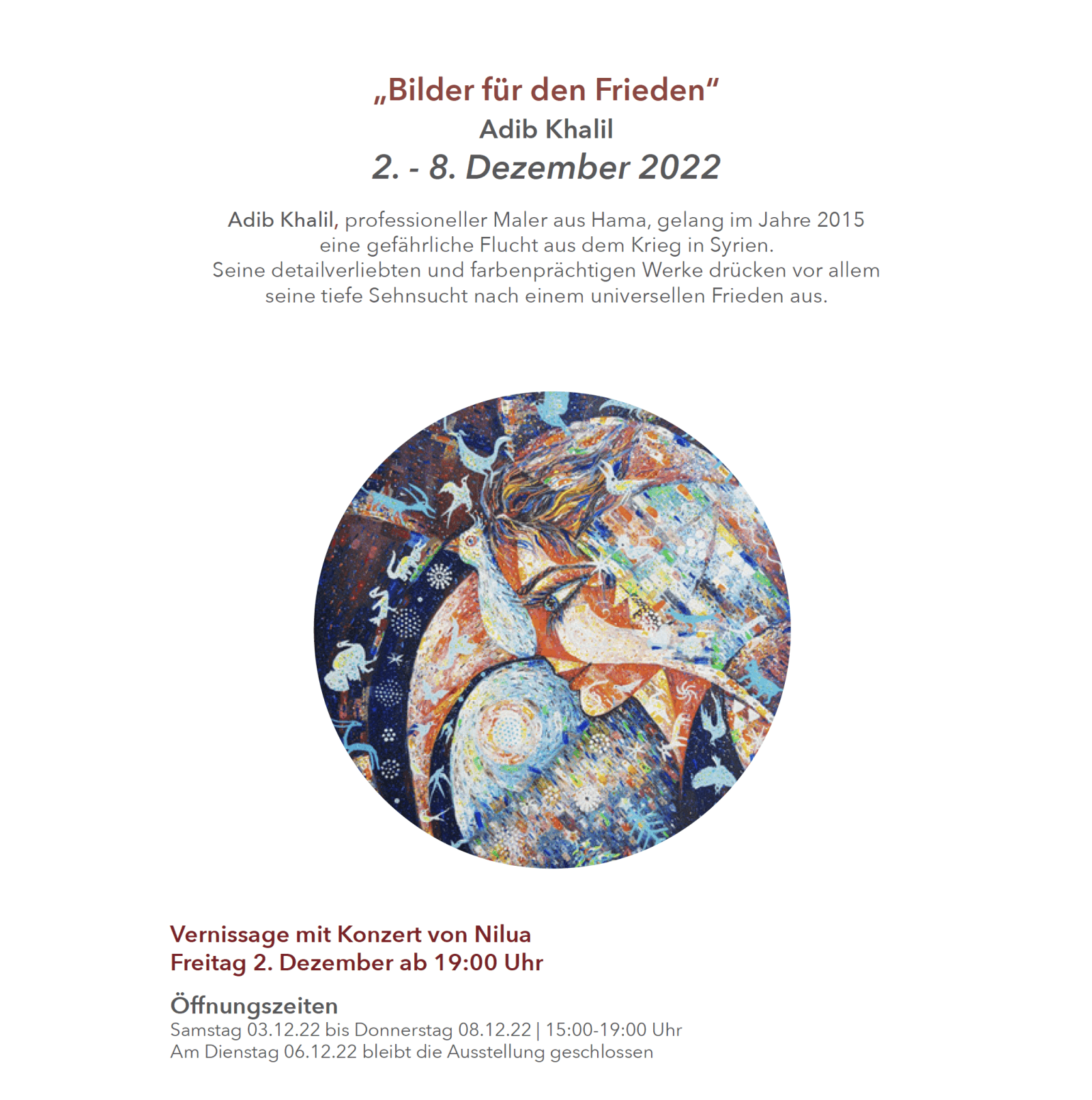 Eröffnet wurde die Serie mit der Ausstellung „Bilder für den Frieden“ (2.-8.12.) von Adib Khalil, einem professionellen Maler aus Hama in Syrien, dem im Jahre 2015 eine gefährliche Flucht aus dem Krieg in seiner Heimat nach Deutschland gelang. Seine detailverliebten und farbenprächtigen Werke drücken vor allem seine tiefe Sehnsucht nach einem universellen Frieden aus. Zur Vernissage am 2. Dezember ab 19 Uhr gab es außerdem ein Konzert der beliebten Sängerin Nilua.