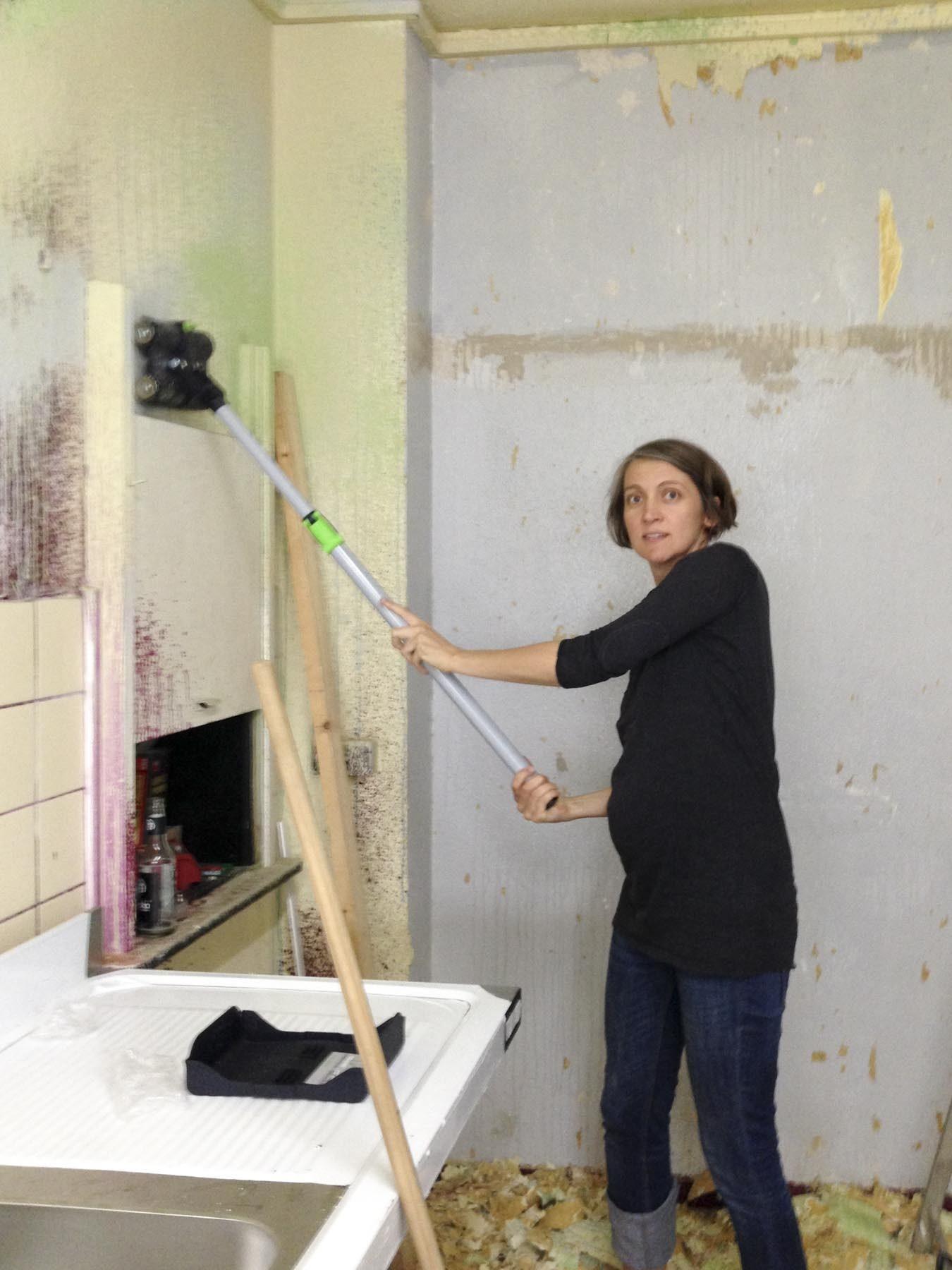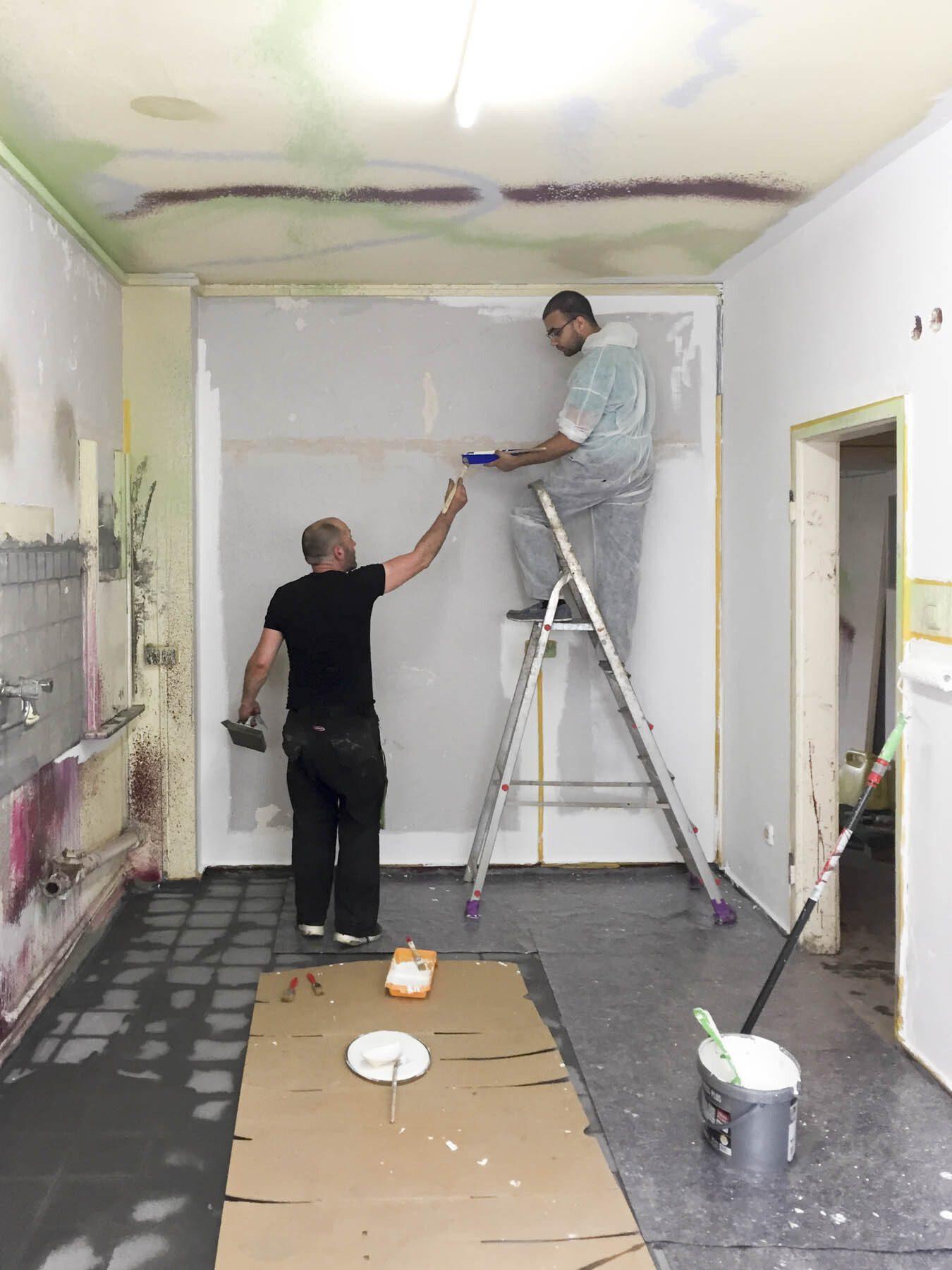 Am nächsten Tag wurden die Pinsel geschwungen und die Wände bekamen einen neuen Anstrich. Das kreative „Sprenkelmuster“ wich einem neutralen Weiß. So ganz wollten wir uns von der wilden Zeit des Anfangs jedoch nicht trennen. Ein einzelner Gedenk-Streifen erinnert nun an den alten Charme.