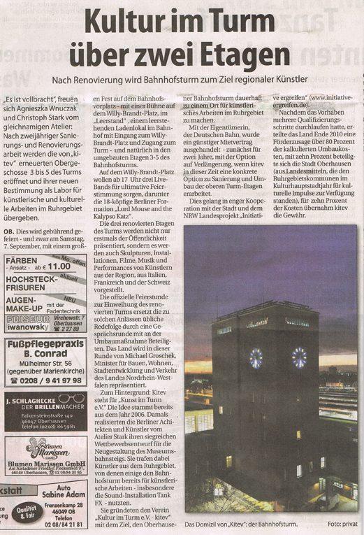 Erste Pressemitteilungen zur Eröffnung des kitev-Turms. Suchspiel: Zwei Fehler sind zu finden. Den Erst-FinderInnen winken a) ein Frei-Coctail an der Bar im 5. OG, der obersten der drei neuen Etagen; b) eine Führung in die noch nicht eröffnete Wassertanketage (6. OG) und aus dieser heraus ein Rundblick über Oberhausen durch die Fenster unter dem Dach des Turms. :)