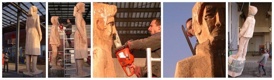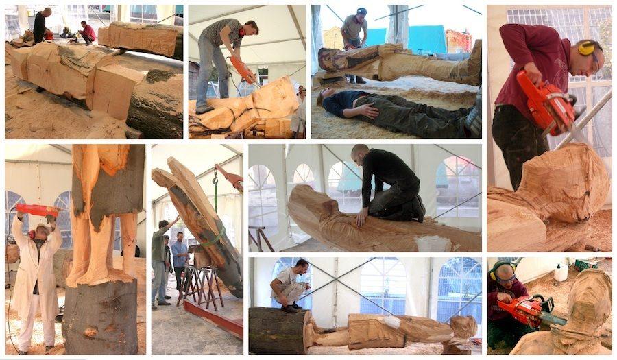 Die Arbeiten begannen. Maße wurden genommen. Modelle gefertigt. Die Ketten der Sägen geschärft. Aus den drei Holzstämmen mit dem Durchmesser von 1m entstanden die Holzfiguren.