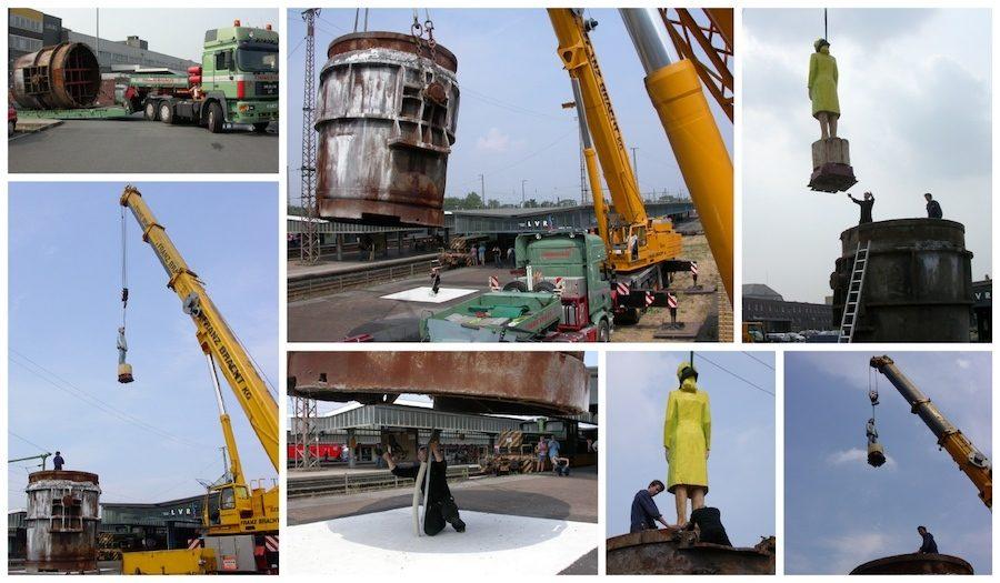 Es war ein aufregender Tag, als die Gießpfannen und die Holzskulpturen auf dem Museumsbahnsteig ankamen. Mit zwei Schwerlasttransportern (beträgt doch ihr Gewicht jeweils 30 Tonnen) wurden die Gießpfannen aus dem Peter-Behrens-Bau mit polizeilichem Begleitschutz hergebracht. Für ihre Aufstellung waren zwei Kräne notwendig.