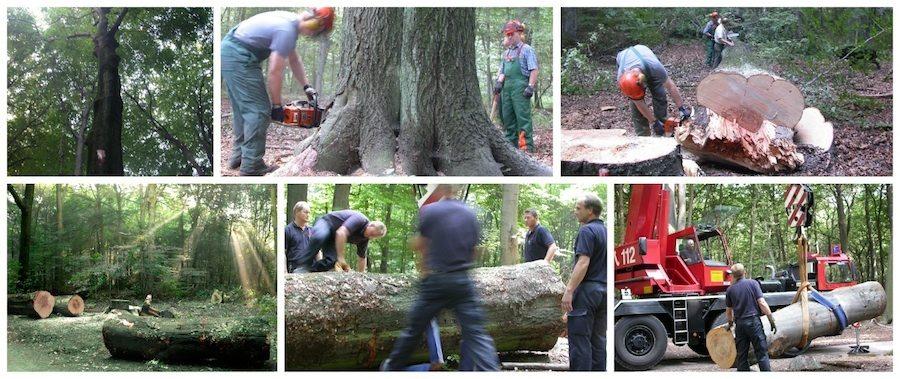 Wir suchten einen Baum mit adäquater Größe: einer, aus dem zwei große Skulpturen auszuarbeiten möglich sein sollte und zudem einen, dessen Zukunft sowieso keine lange mehr sein würde: Die Buche stand geneigt am Wegesrand. Ihre Anwesenheit störte den regen Verkehr von Nordic Walkern. Ihre Tage waren demnach gezählt.
