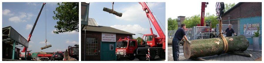 Die Oberhausener Feuerwehr war so hilfsbereit den Transport zu übernehmen. Die Holzstämme wurden zum Rheinischen Industriemuseum gefahren und dort per Kran auf das Gelände des Stadtmodells gehoben.