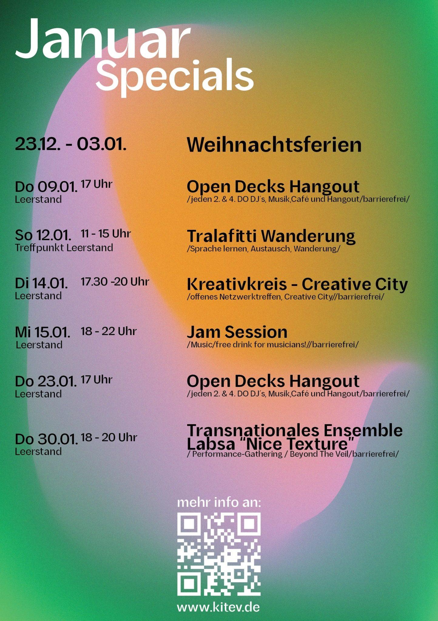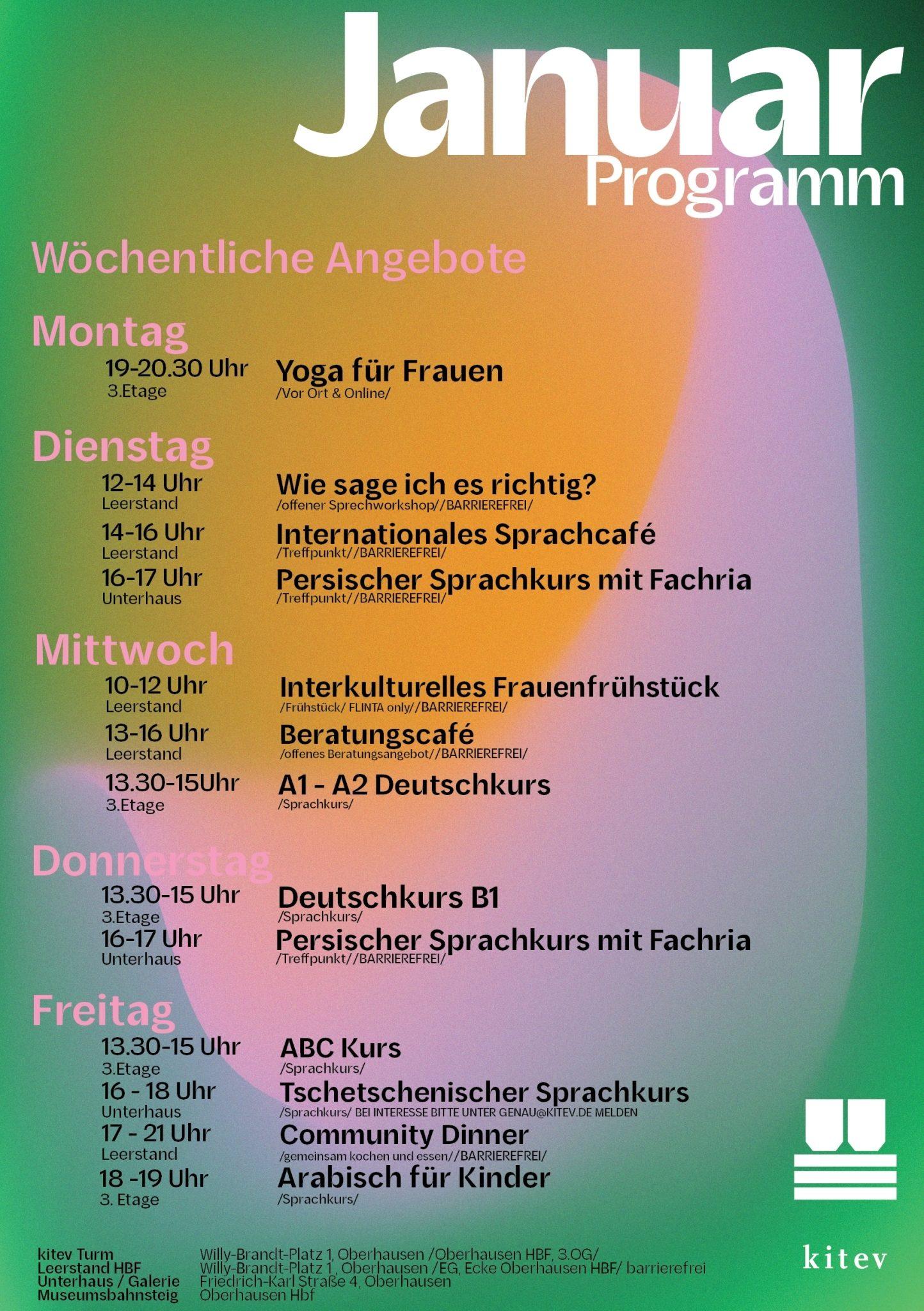Wir starten ins Jahr 2024 mit einem vielseitigen und lebendigen Januar-Programm bei kitev, das voller wöchentlicher Angebote und besonderer Highlights steckt, um die Winterzeit zu beleben. Ob ihr kreative Inspiration, Sprachaustausch oder Gemeinschaft sucht – in diesem Monat ist für jede*n etwas dabei.