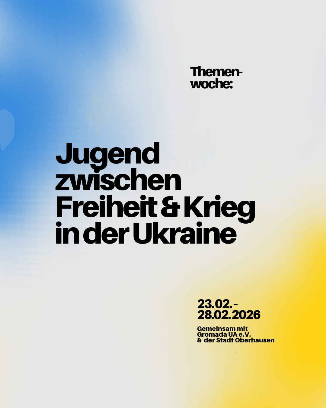 Gemeinsam mit Gromada UA e. V. und der Stadt Oberhausen laden wir rund um den 24. Februar zur Themenwoche „Jugend zwischen Freiheit & Krieg in der Ukraine“ ein.