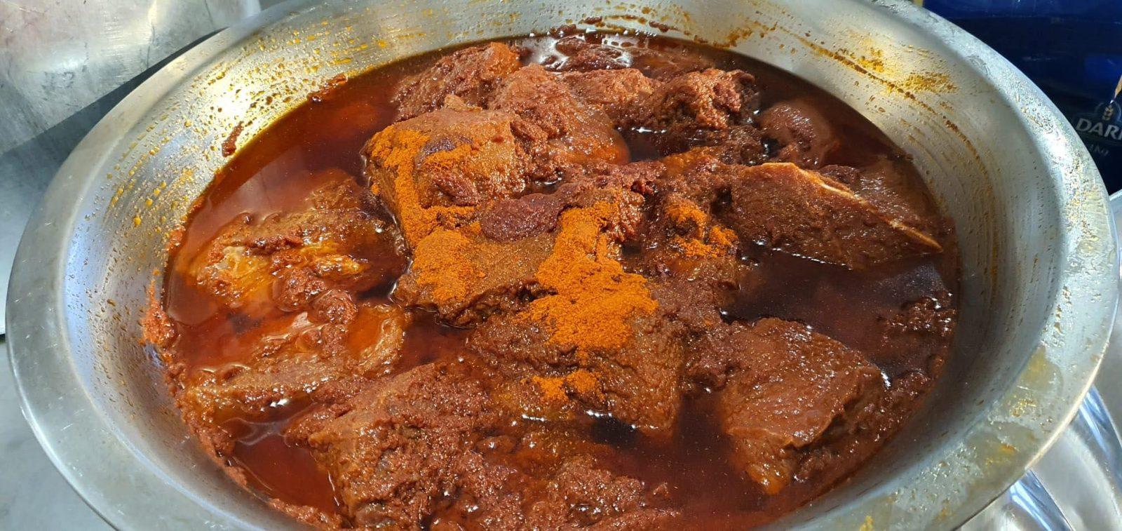 Zuerst fangen wir an, das Fleisch zuzubereiten und zu würzen.Wir bereiten eine tiefe Schüssel vor, dann beginnen wir, das Fleisch zu schneiden und in die Schüssel zu geben, dann geben wir die Hälfte der Tomatenmark und Paprika darauf.Dann das Salz hinzugeben und alle Zutaten mit etwas Wasser gut verrühren.Lassen Sie das Fleisch in der Marinade beiseite, damit es alle Gewürze aufnimmt.Dann beginnen wir mit der Zubereitung der Sauce, stellen eine Bratpfanne auf das Feuer und gießen dann einen Topf Öl hinein.Wenn das Öl heiß wird, die Zwiebeln hinzugeben und gut umrühren, dann das zuvor gewürzte Fleisch unter weiterem Rühren dazugeben. Fügen Sie das restliche Tomatenmark, die scharfe rote Paprika und die schwarze Paprika hinzu, geben Sie eine kleine Menge Wasser hinzu und lassen Sie die Sauce etwa 10 Minuten lang bei schwacher Hitze stehen.