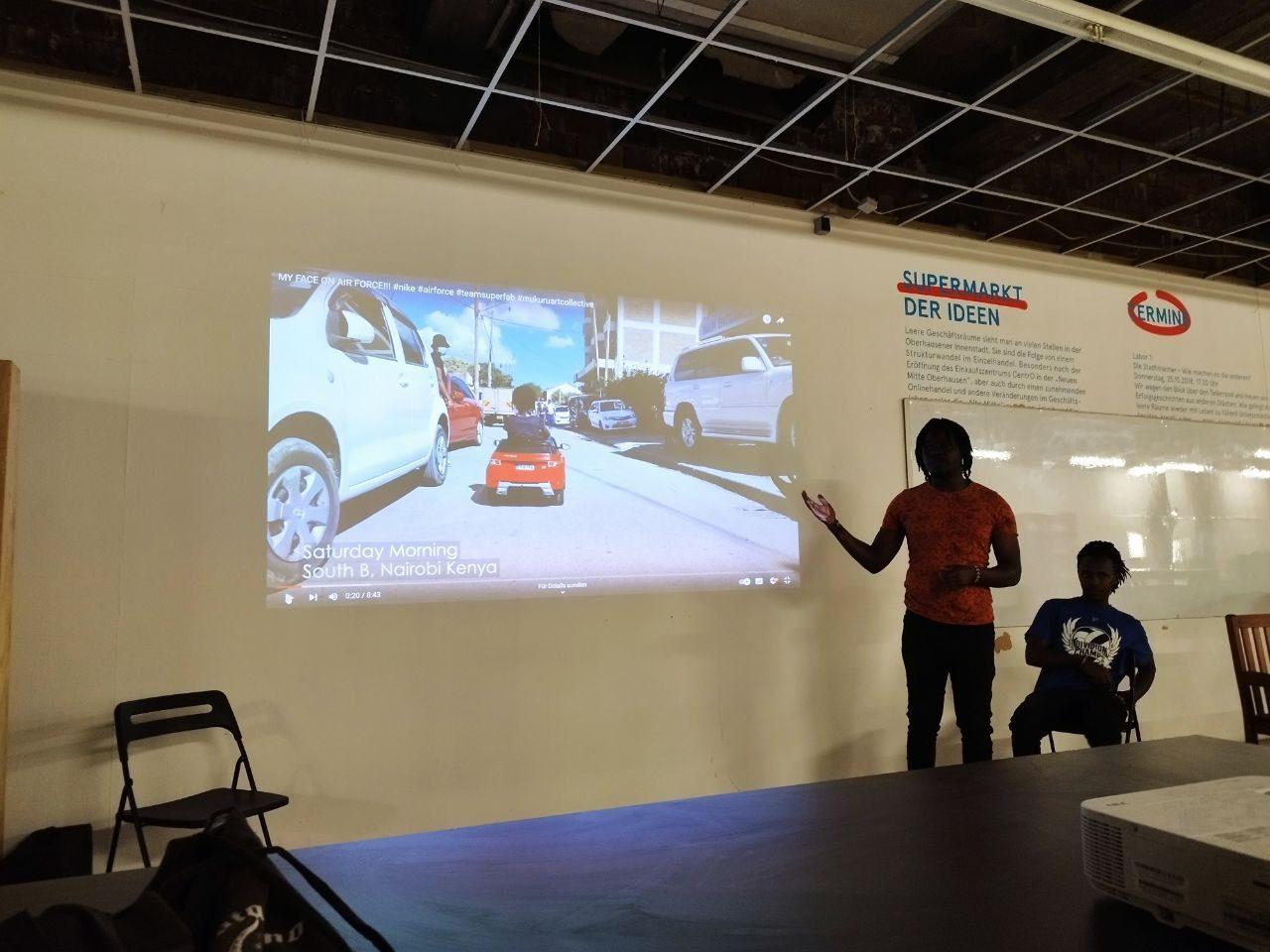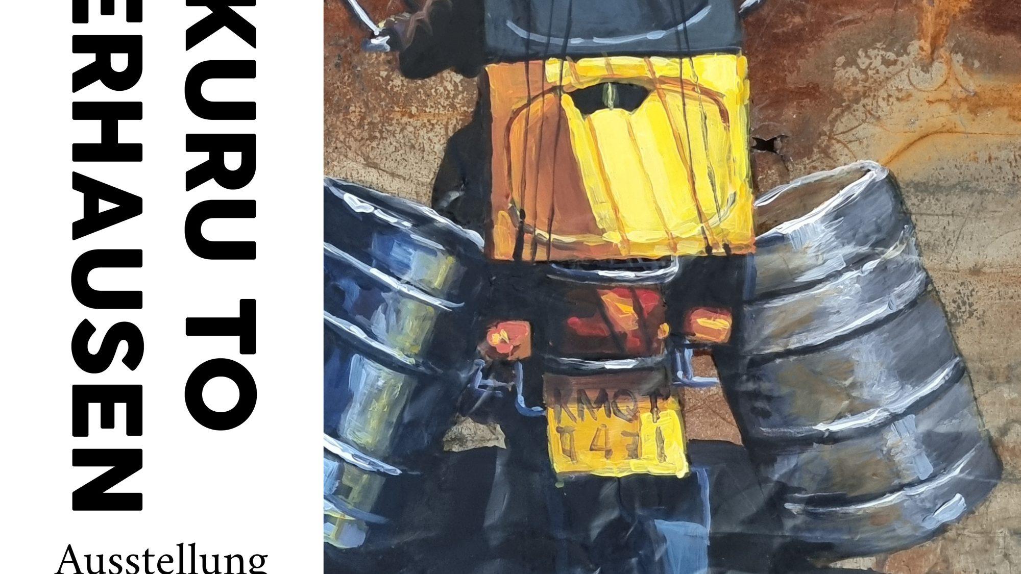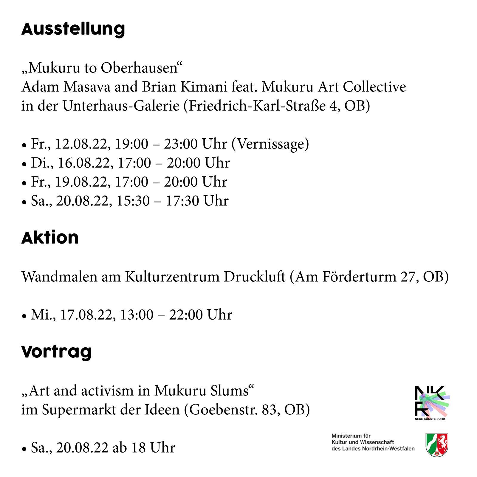 Adam Masava und Brian Kimani kommen mit vielen Bildern im Gepäck mit dem Zug in Essen an. Ihr erster öffentlicher Termin ist ein Presse-Meeting zusammen mit dem Mülheimer Künstler Hardy Bock vor dem gemeinsamen Mural in der Mülheimer Innenstadt. Die ersten Aktivitäten sind Besuche bei Freunden und eine Garten-Ausstellung im kleinen Rahmen. Die nächste Woche ist durch die Vorbereitung und den Aufbau der Ausstellung "Mukuru to Oberhausen" bestimmt, die am 12.08. in der Unterhaus Galerie eröffnet wird. Viele Besucher*innen aus Oberhausen und Umgebung erleben eine feierliche Vernissage mit Kunst, einer kulinarischen Kitchen Performance der Refugees Kitchen und schließlich einer spontanen Live-Musik Session mit lokalen Musiker*innen und Brian Kimanis Rap auf Suaheli.