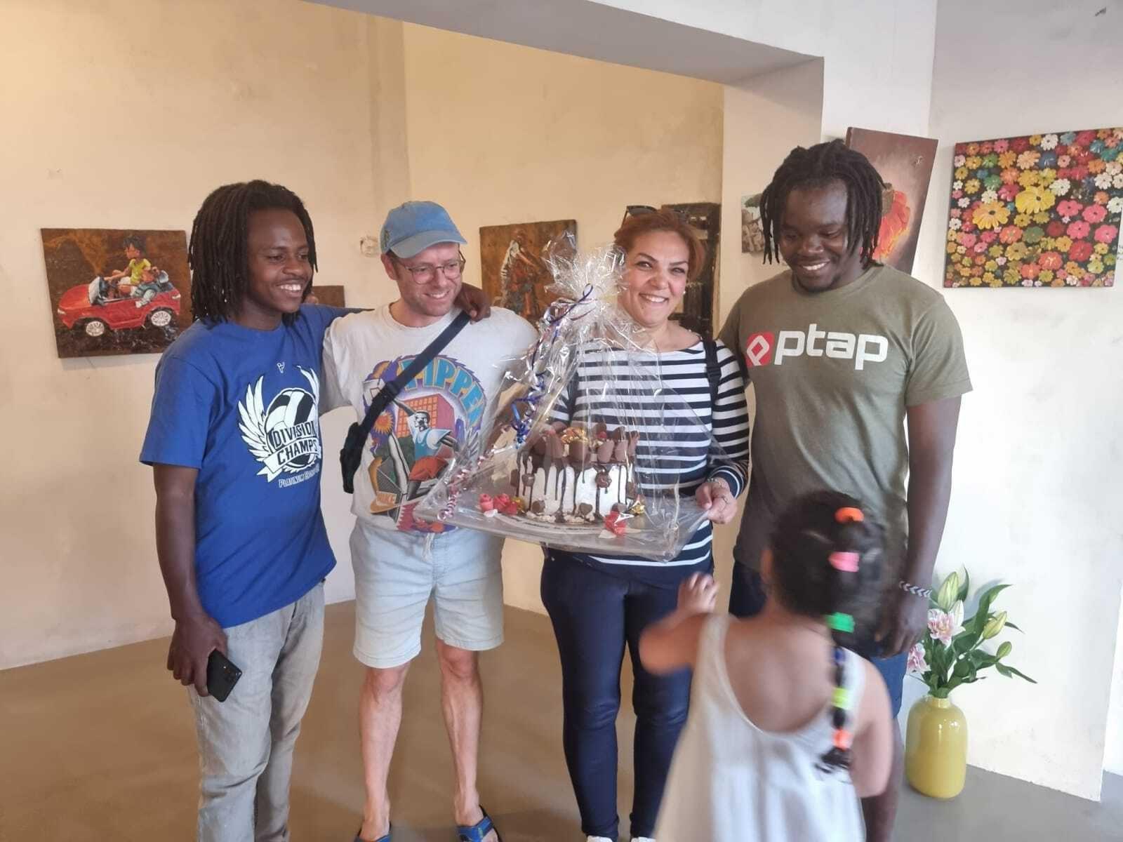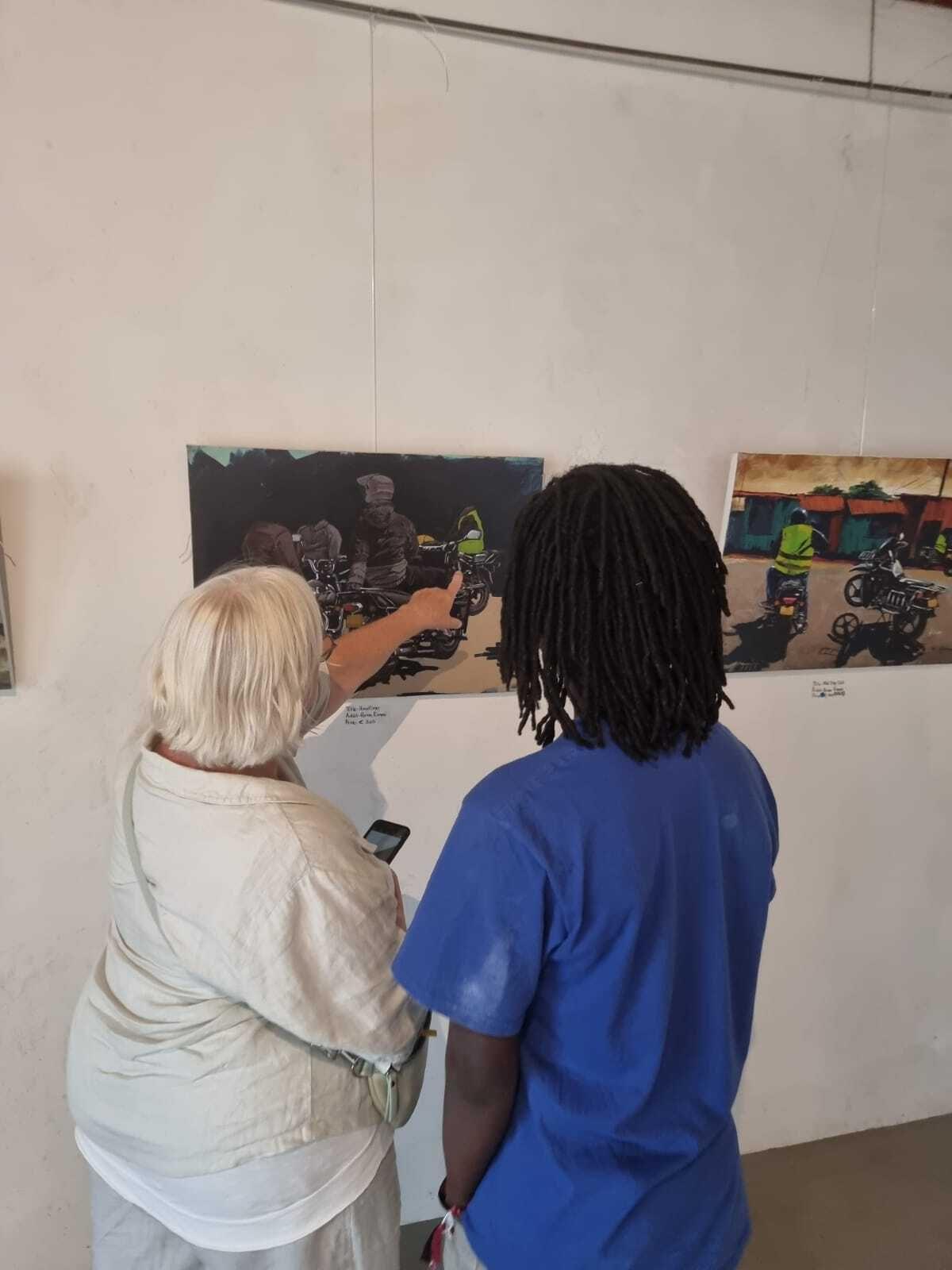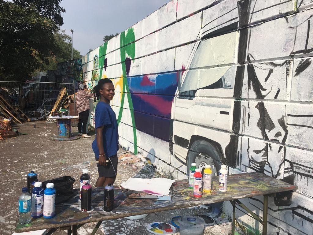 Adam Masava und Brian Kimani kommen mit vielen Bildern im Gepäck mit dem Zug in Essen an. Ihr erster öffentlicher Termin ist ein Presse-Meeting zusammen mit dem Mülheimer Künstler Hardy Bock vor dem gemeinsamen Mural in der Mülheimer Innenstadt. Die ersten Aktivitäten sind Besuche bei Freunden und eine Garten-Ausstellung im kleinen Rahmen. Die nächste Woche ist durch die Vorbereitung und den Aufbau der Ausstellung "Mukuru to Oberhausen" bestimmt, die am 12.08. in der Unterhaus Galerie eröffnet wird. Viele Besucher*innen aus Oberhausen und Umgebung erleben eine feierliche Vernissage mit Kunst, einer kulinarischen Kitchen Performance der Refugees Kitchen und schließlich einer spontanen Live-Musik Session mit lokalen Musiker*innen und Brian Kimanis Rap auf Suaheli.