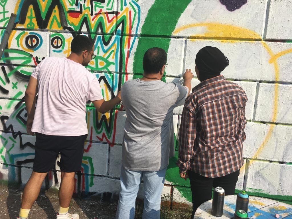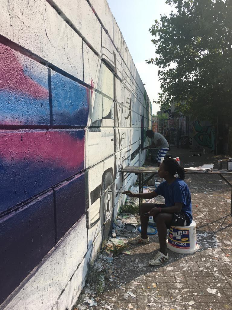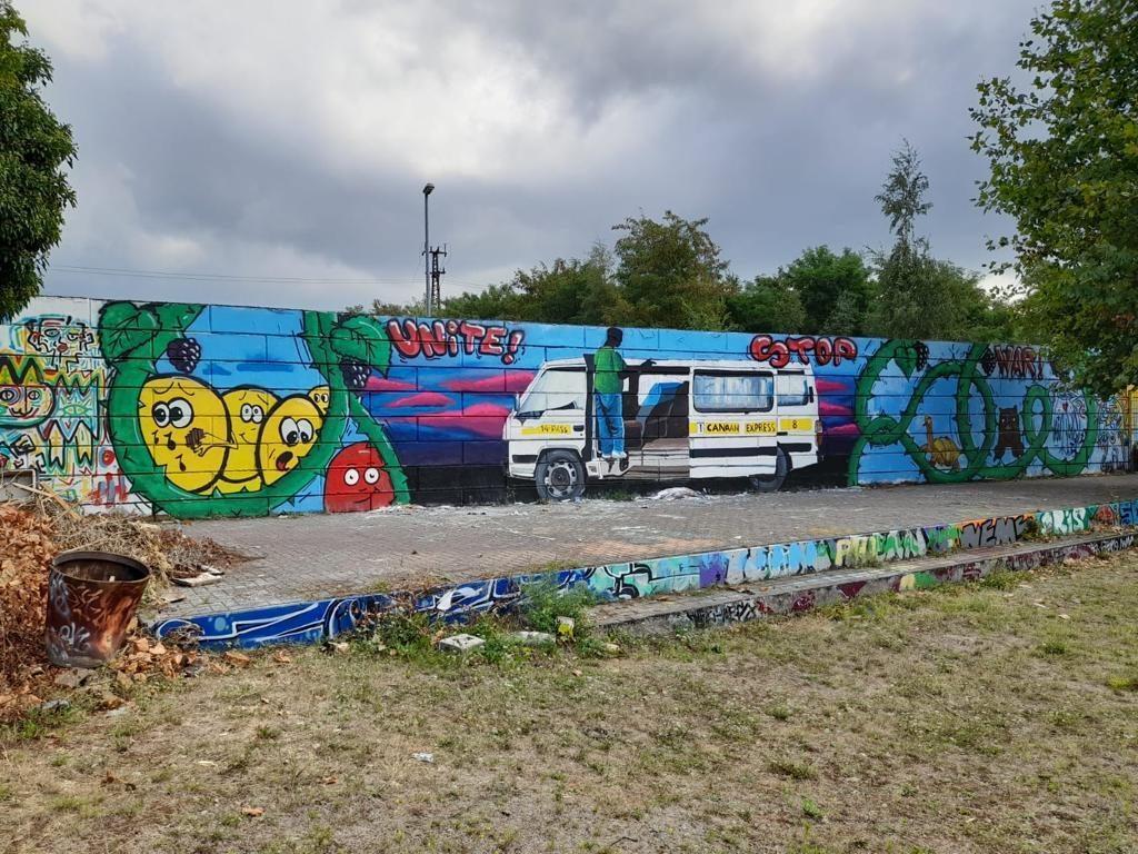 Nach all dem internationalem "Meet and Greet" ist in der nächsten Woche wieder Programm in Oberhausen. Mehrere Öffnungstage der Ausstellung und eine Wandmalaktion am Kulturzentrum Druckluft. Hier kommt es zum Austausch mit Teilnehmer*innen aus der kitev-Community, Künstler*innen aus dem Ruhrgebiet und sogar spontanen Gästen aus Istanbul. Mit einem Dutzend Menschen wird die 30 Meter lange Mauer des Innenhofs mit Motiven aus unterschiedlichen Kulturen gestaltet und mit der globalen Friedensbotschaft "Unite! Stop war!" versehen.