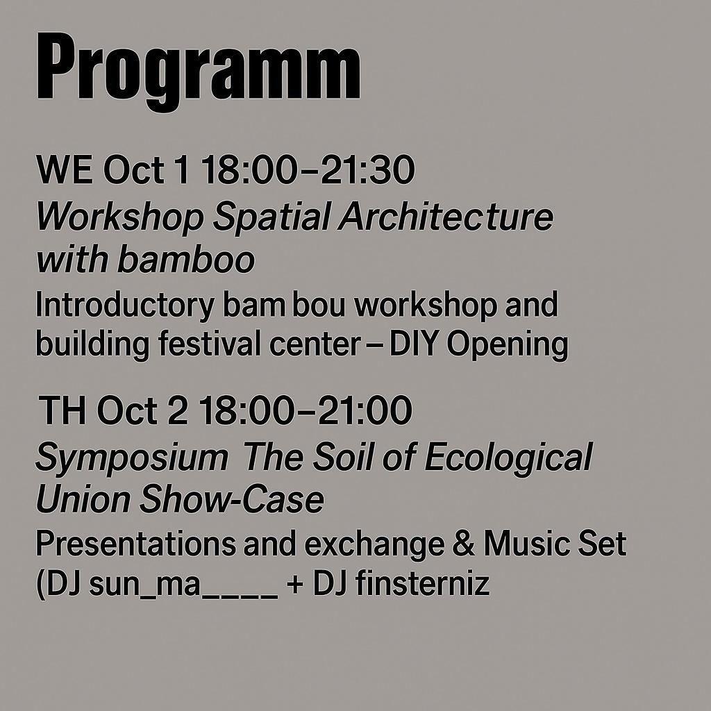 The program features two process-based and participatory artistic approaches: the workshop series Sonic Spores (curated by Margo Zailīte) and the discursive project The Soil of Ecological Union (curated by Yuri Yefanov & Natalia Matsenko). The exhibition includes visual, sonic, and spatial elements, accompanied by public workshops. The results of the symposium The Soil of Ecological Union are also presented within the exhibition. The symposium went through the topics of soil and utopian ideas around it, ecology and technology, non-human life and community awareness, urban nature, gardens and forests, art and activism. Sonic Spores includes three workshops: building a bamboo-based spatial installation, experimenting with electric sounds, and co-creating AI-assisted music from inspirational songs of Refugees Kitchen Community.