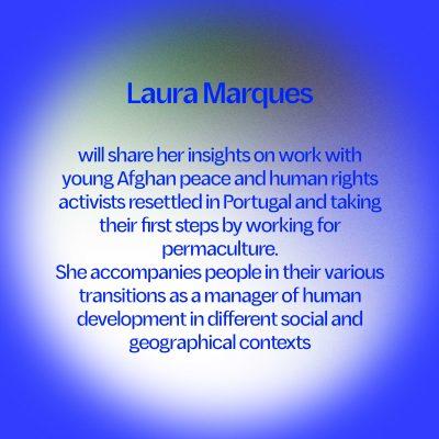 Laura Marques will share her insights on work with young Afghan peace and human rights activists resettled in Portugal and taking their first steps by working for permaculture. Laura Marques holds a degree of social work from the University of Coimbra and a MA from London Metropolitan University. She accompanies people in their various transitions as a manager of human development in different social and geographical contexts. She collaborates as an eco-social worker in the Terra de Abrigo project that welcomes refugees, peace, and human rights activists, in Terra Sintropica Foundation in Mertola, Portugal.
