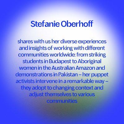 Stefanie Oberhoff (tbc) shares with us her diverse experiences and insights of working with different communities worldwide: from striking students in Budapest to Aboriginal women in the Australian Amazon and demonstrations in Pakistan – her puppet activists intervene in a remarkable way – they adopt to changing context and adjust themselves to various communities. Stefanie Oberhoff is a stage designer, puppeteer, and director. Since 2005 she has been organizing international cultural projects at the interface of visual arts, puppet theatre, animation and social intervention in Europe, Asia, and Africa. She has taught at State Academy of Fine Arts Stuttgart/Germany, State University of Music and Performing Arts Stuttgart, Stuttgart University of Applied Sciences and the Beaconhouse National University Lahore/Pakistan.
