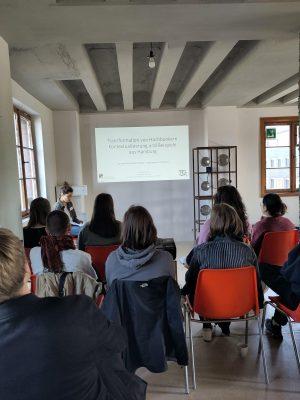 Am ersten Tag der Spring School erhielten die Teilnehmenden zunächst einen direkten Eindruck vom Hochbunker bei einer Besichtigung vor Ort. Anschließend folgten spannende Fachvorträge: Die Wissenschaftlerin Clara Da Ros von der Universität Hamburg referierte über die Transformation von drei Hochbunkern in Hamburg, während Studierende der Raumplanung des StadtPraxisLabors der TU Dortmund unter dem Namen „Bunker PLUS“ ihre ersten Ideen zu städtebaulichen Interventionen und Beteiligungsmöglichkeiten präsentierten. Im Anschluss arbeiteten die Teilnehmenden der Spring School in drei Teams an ihren eigenen Ideen und Entwürfen.