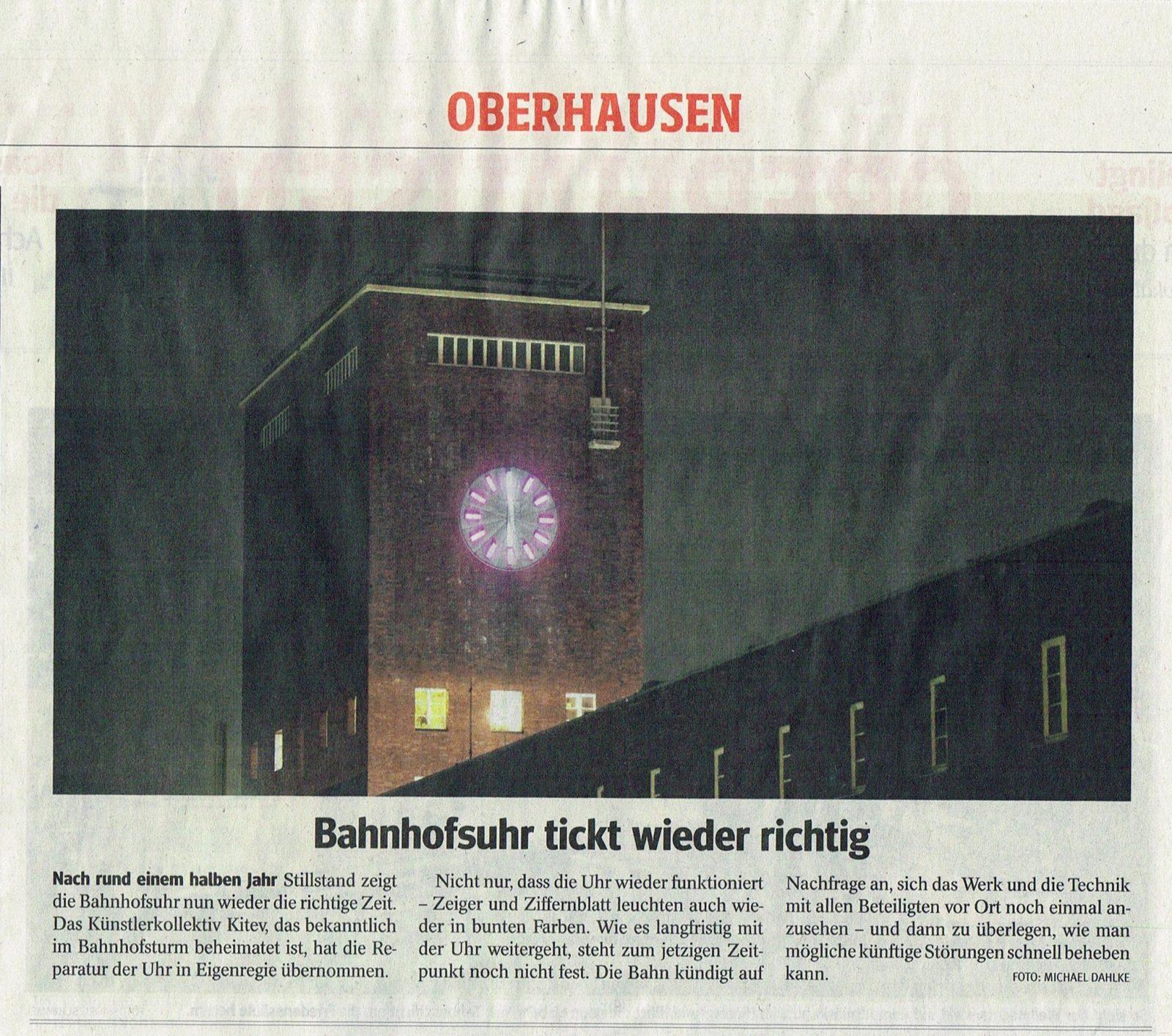 Ein halbes Jahr wurden wir gefragt was mit der Uhr sei: Die Bahn hatte die Zuständigkeit für die Wartung an sich genommen und die Uhren standen seitdem still. Nach monatelangem Debakel haben sich unsere Künstler Christoph Stark und Samuel Kress ein Herz gefasst und sie wieder zum Leben erweckt – ein Weihnachtsgeschenk an alle Oberhausener*innen und Reisende.