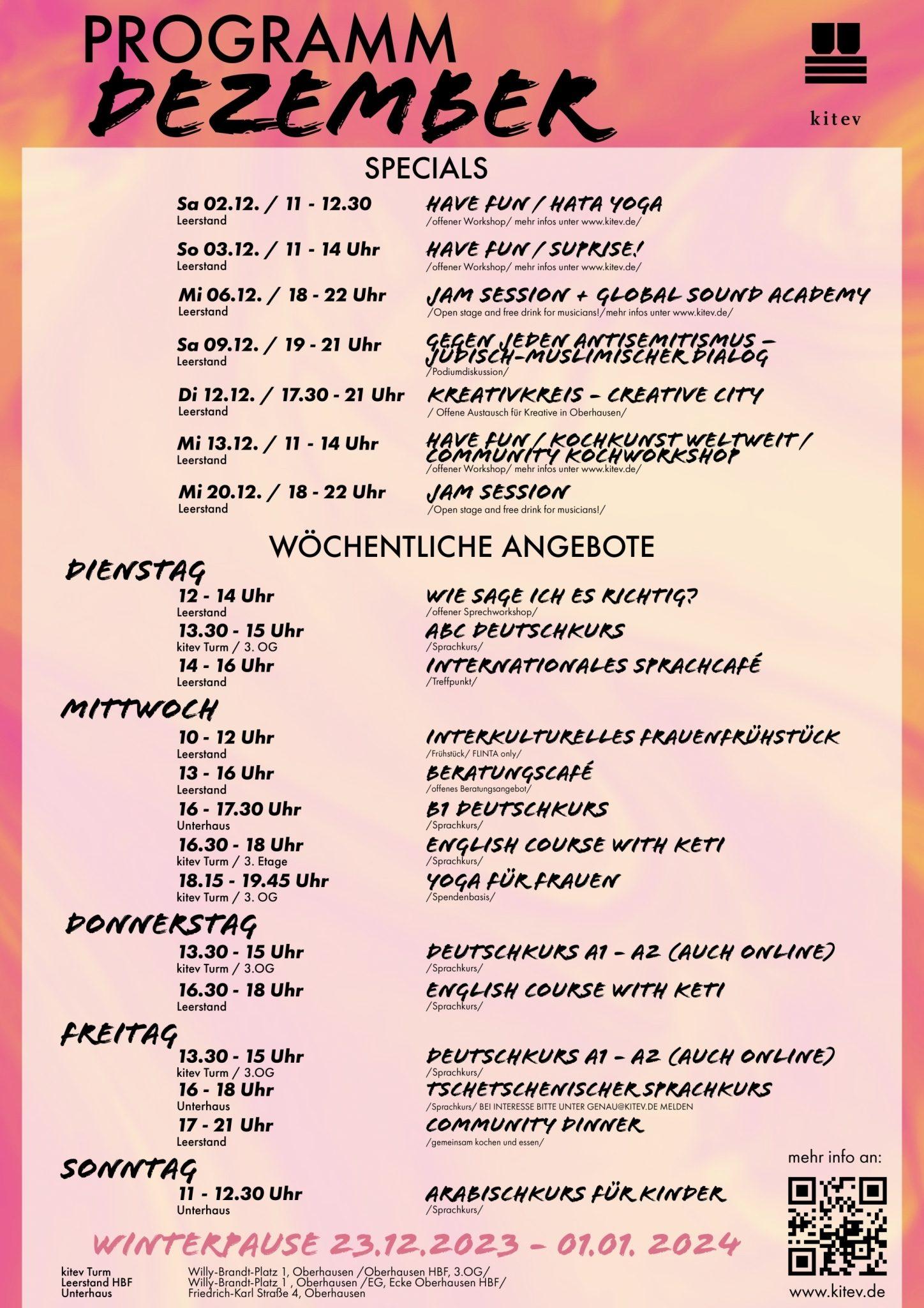 Herzlich willkommen beim kitev Dezember Monatsprogramm, das den Winter mit unserem "Have Fun" Projekt einläutet. Der Monat beginnt mit Aktivitäten wie Hatha-Yoga für Entspannung und Überraschungs-Events, um die Dinge spannend zu gestalten.