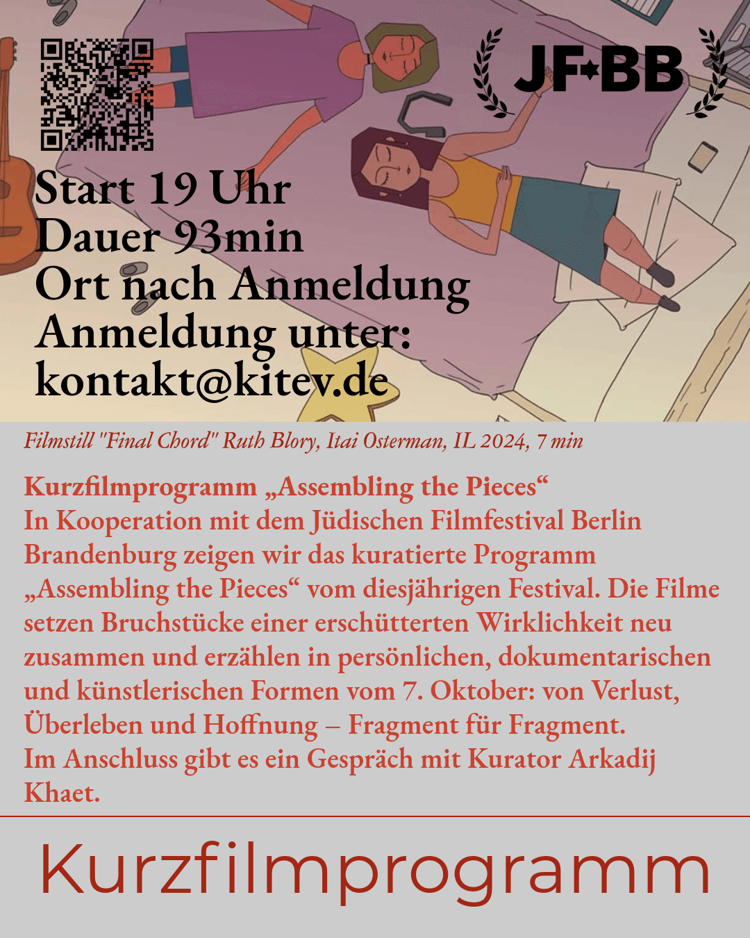 Im Rahmen des Kurzfilmprogramms „Assembling the Pieces“, in Kooperation mit dem Jüdischen Filmfestival Berlin Brandenburg, setzen die Filme Bruchstücke einer erschütterten Wirklichkeit neu zusammen. Sie erzählen von Verlust, Überleben und Hoffnung – Fragment für Fragment. Im Anschluss gibt es ein Gespräch mit Kurator Arkadij Khaet.