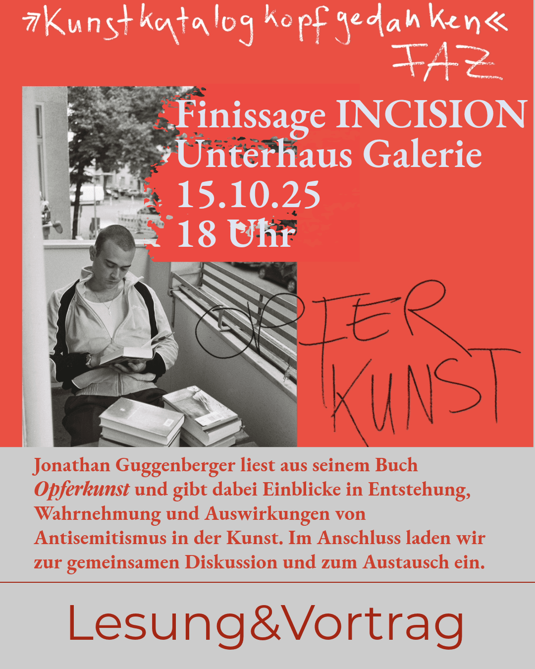 Jonathan Guggenberger liest aus seinem Buch Opferkunst und gibt dabei Einblicke in Entstehung, Wahrnehmung und Auswirkungen von Antisemitismus in der Kunst. Im Anschluss laden wir zur gemeinsamen Diskussion und zum Austausch ein.