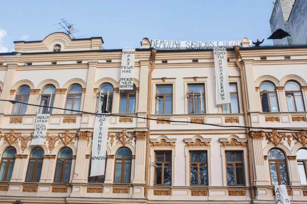 Nun also, in Kiew folgte der zweite Streich – die „Besetzung“ des Kulturministeriums der Ukraine. Vom Hochhaus zum Ministierium! Schön, dass wir das im nun gewachsenem Team gemeinsam in die Tat umsetzen konnten! Die Sprüche über Dominanz und Unterwerfung, der BDSM Szene entlehnt, reflektieren die Arbeitsbeziehung zwischen der Künstlerszene und einer staatlichen Institution, wie dem Ministerium für Kultur. Erniedrigung, Zensur, Abhängigkeiten und selbst-auferlegte Zwänge spiegeln das gegebene Machtgefälle zwischen den Kunstinstitutionen und den Künstlerinnen.