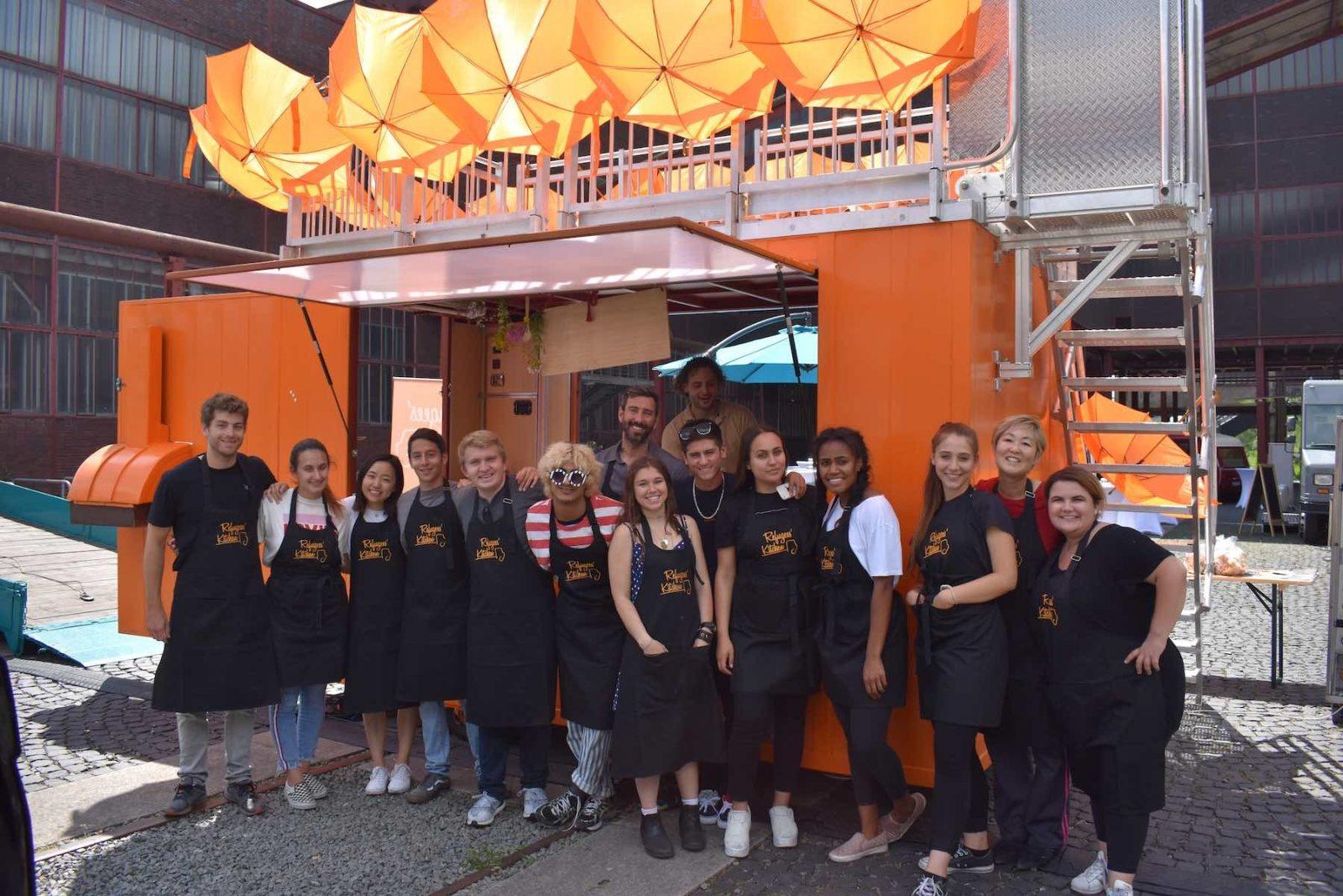 In den letzten Wochen hatten wir Fans aus den USA zu Gast. Die 20 StudentInnen aus den Bereichen Design und Marketing hatten es sich zur Aufgabe gemacht unter dem Titel "Marketing for Good" zivilgesellschaftliche Initiativen und Gemeinschaftsprojekte in Deutschland kennenzulernen und passende Design- und Marketingkonzepte für diese engagierten Projekte zu entwerfen. Hierfür hat die Gruppe plus Dozenten mehrere Tage bei uns im Turm und um die Ecke im Unterhaus verbracht. Sie haben Ideen entwickelt für ein mögliches Catering-Konzept für die Refugees Kitchen als Teil der Ruhrtriennale, oder aber direkt beim Kochen für das D.Ramadan-Festival mitangepackt. Zudem waren sie live dabei, als wir die Refugees` Kitchen auf Zeche Zollverein platzierten und die Gäste des Symposiums „Glückauf Nachbarn – Modellquartier Integration“ von unserem Konzept begeisterten.