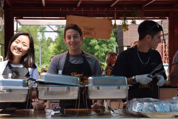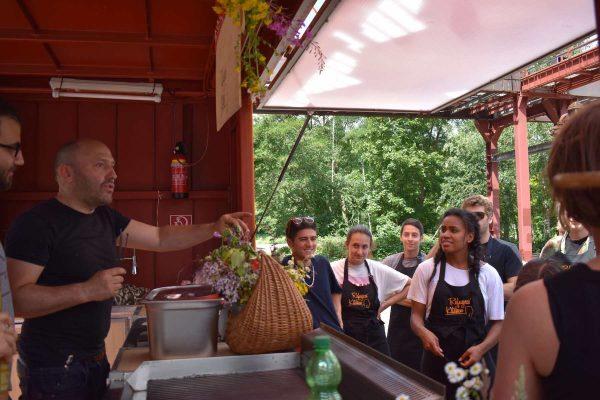 In loose keeping with the Ramadan practice of waiting until after sundown to breakfast, Kitev and the students toiled away tirelessly with the goal of serving Sunday dinner at Oberhausen Theater’s outdoor picnic area. Stefl and a group of marketing majors and studio arts students tore down interior structures for the warehouse’s renovation and took culinary direction from the kitchen team. Meanwhile, the design group sweated amongst a floor full of blueprints of the venue space for which they were to create promotion and spatial design, including signage and wayfinding for the upcoming event. By dinnertime, the design group was ready to contemplate its potential solutions over a meal under the Oberhausen Theater’s twinkling lights. Helping the Refugee Kitchen transport and serve a meal that night would be a critical step in the group’s project development, as it would help them understand how the chefs run the kitchen’s catering services.