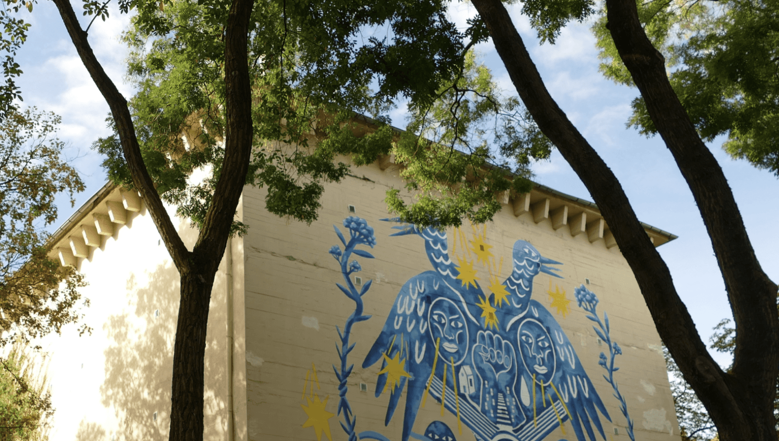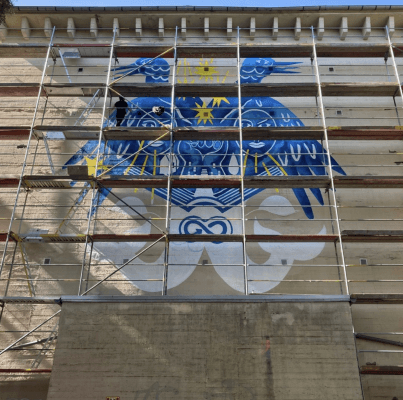Eine weitere künstlerische Arbeit entstand ebenfalls im Duett. Aaron St (Ruhrgebiet) und Katja Bot (Paris) erschufen zunächst in gemeinsamer künstlerisch-konzeptioneller Arbeit und im September 2020 in einer zweiwöchigen Mal-Aktion ein großflächiges Wandbild auf der Fassade des Bunkers am Ebertplatz.
